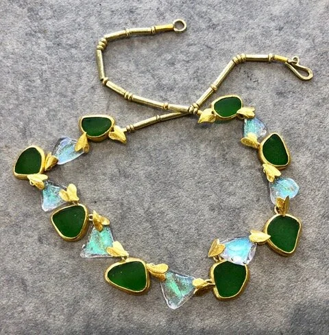 This necklace was commissioned by Marian who wanted a special piece for her daughters wedding. She loved the idea of a rich buttery gold necklace draped in opals but was restricted by the cost. Charmian came up with the idea of combining beautiful translucent green sea glass with dichroic glass which contained the same opalescent qualities as real opals. The metal components were made entirely out of solid 22ct and 18ct gold.